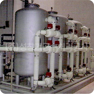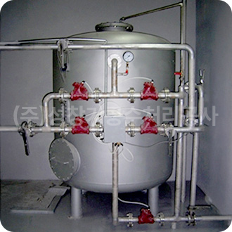 A pressure filtration device is a system where a lower collection device with strainers is placed inside a sealed vessel. Support media such as gravel and sand are laid on top, followed by filling with anthracite or sand. As raw water passes through this filter bed, suspended solids and turbidity are removed. The suspended solids that remain on top of the filter bed can be removed through backwashing operations using valves.