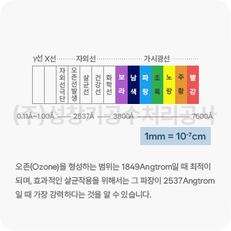 자외선 에너지는 저압의 수은 등에서 방출되며 이러한 살균 LAMP는 특수한 경질유리(HARD GLASS)로